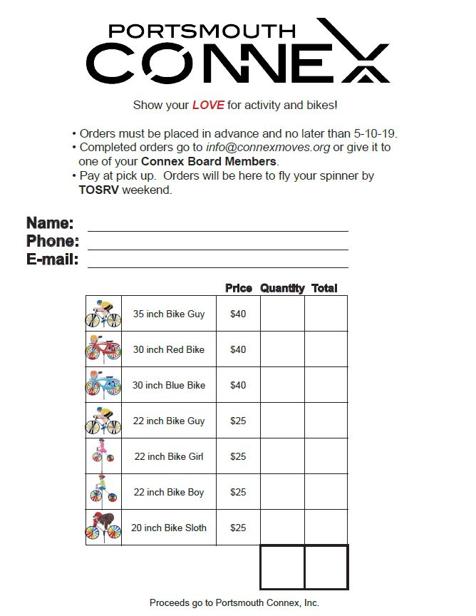 CONNEX FUNDRAISER! Get your yard spinner and show your support for Connex and TOSRV! Get your order in by May 10th and have your spinner in time for TOSRV on May 18th! Download the order form, fill it out and send it back to us. Email it to , fax it to 740-289-4814 or text an image to 740-370-9339.