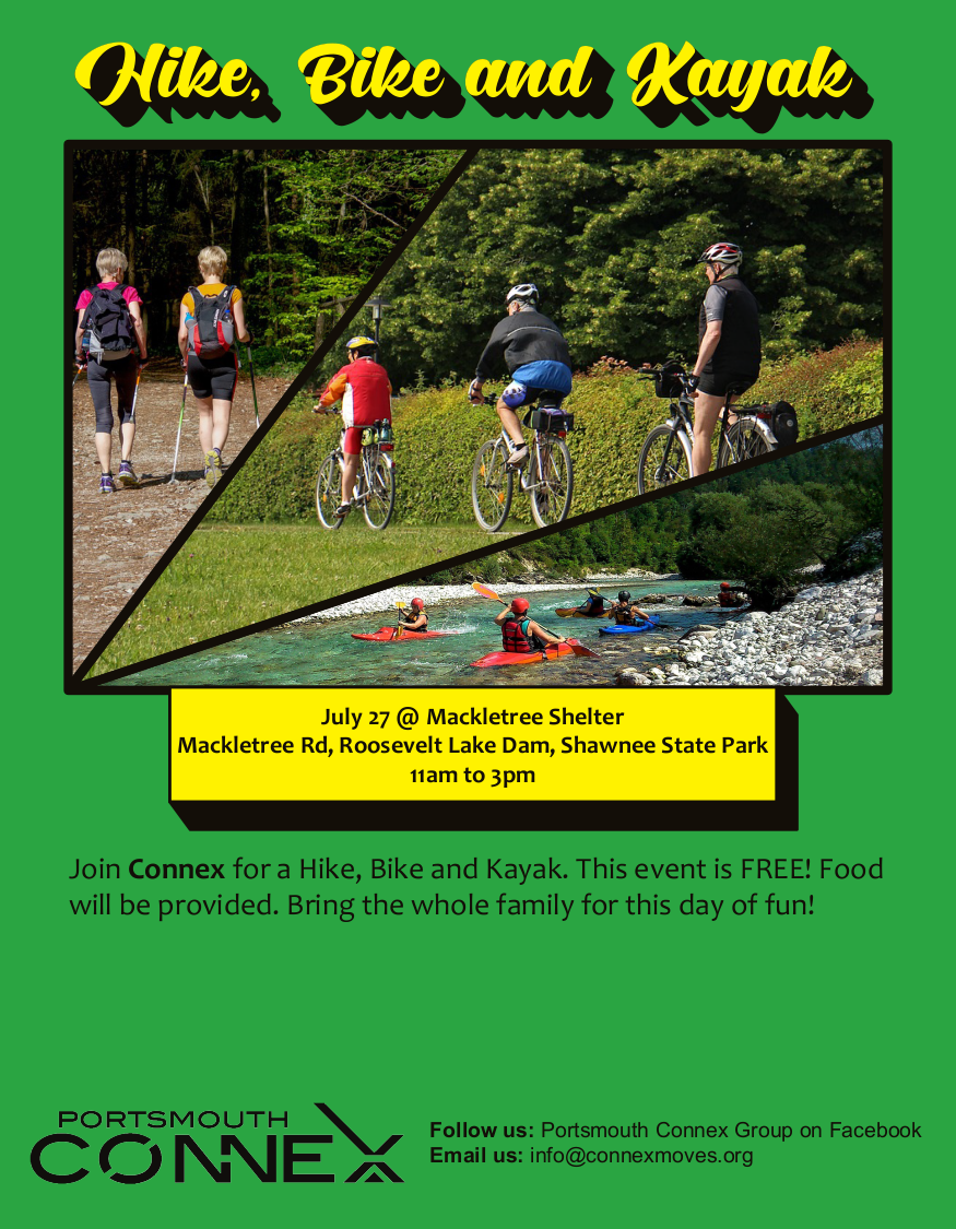 Join Connex for our 3rd annual Hike, Bike & Kayak event on July 27th from 11:00 – 3:00 out at Mackletree Shelter by Roosevelt Lake, Shawnee State Park. Refreshments and hot dogs will be served. Come take a bike ride on the forest roads, or a hike up to lookout point, or kayak on the lake, or just do it all! The event is free but you need to bring your own equipment. Come join us as we enjoy our beautiful local park!