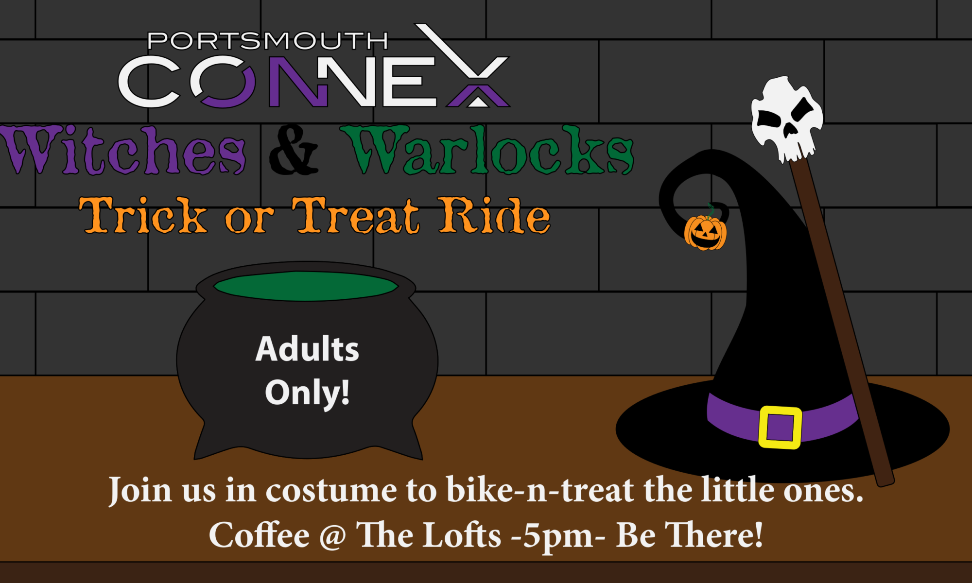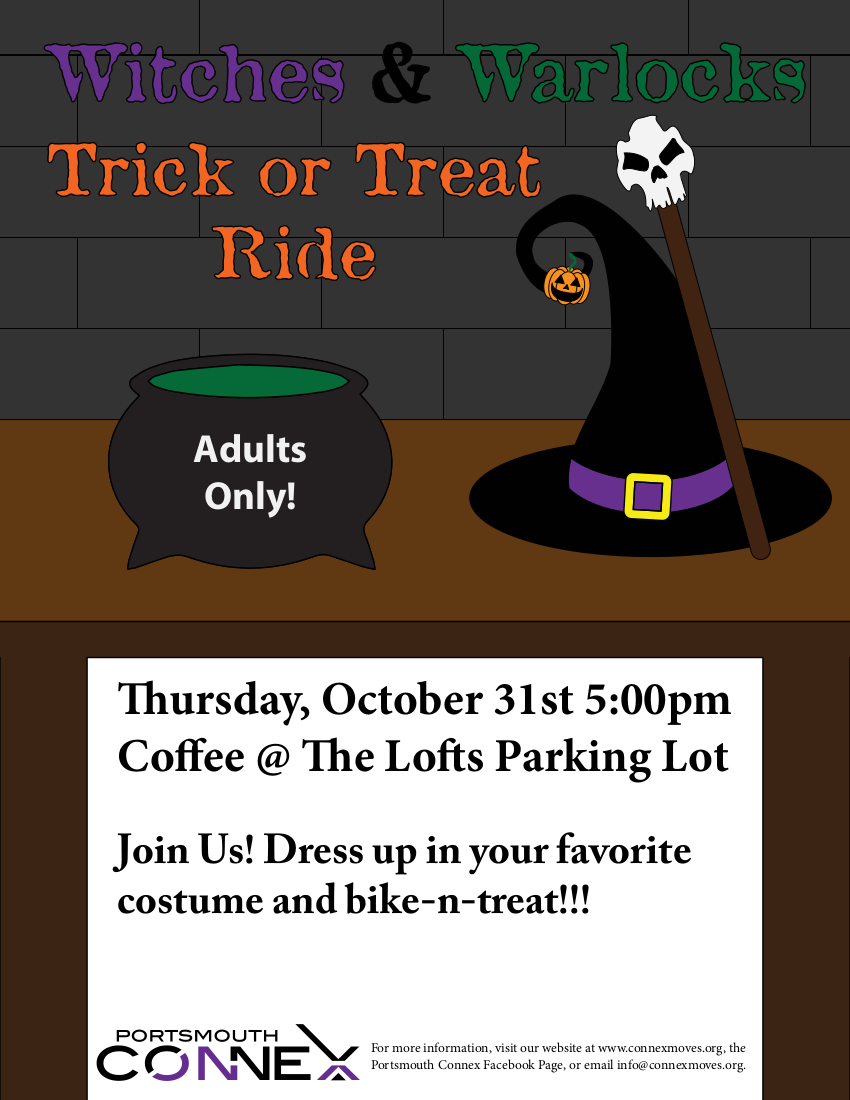 Join Connex for our annual Halloween Witches & Warlocks bike ride through the neighborhoods of Portsmouth to pass out treats to the kids. Meet the the Loft’s parking lot on 4th and Gay streets at 5:00 pm dressed in costume. Riders must be 18 years old or older and supply their own treats to hand out. We make an exception to our helmets rule this time but riders ride at their own risk. Think safety when designing your costume! You don’t want to have things get tangled in wheels or gears and you want to be able to see. You should have lights on your bike because it does get dark before it’s done. This is our 4th year of doing this event and it’s a lot of fun for the riders as well as the kids! So get your costume ready and come on down!