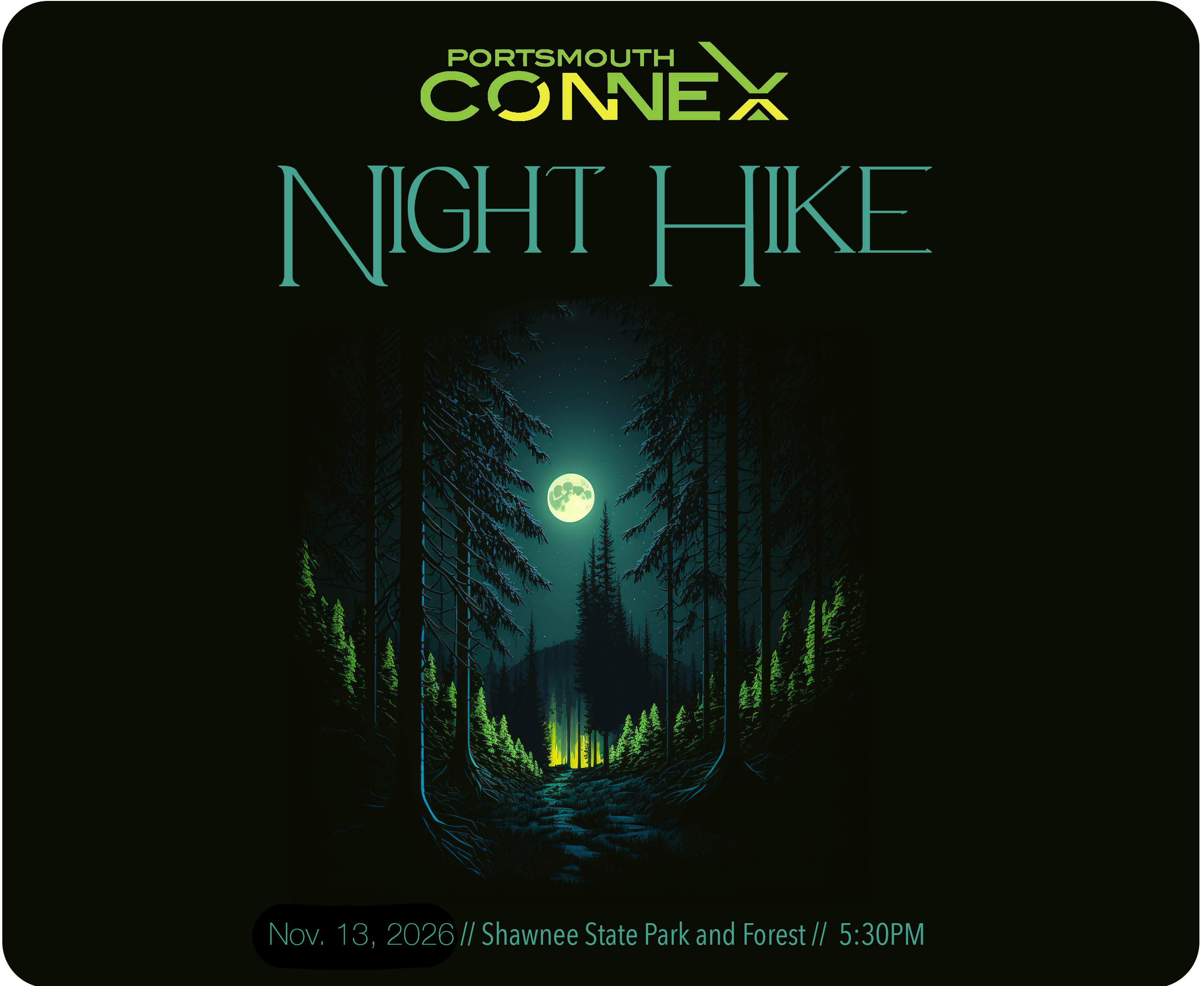 Join us for the annual Connex Night Hike, Friday, November 13 at Shawnee State Park and Forest, meeting in Shawnee State Park. Starting at 5:30PM we will trek through Shawnee forest and end at a cozy campfire. Hikers can choose between treking 1, 2 or 2.5 mile options. We ask hikers to bring a flashlight and those who wish to stay for the campfire are encouraged to bring their own chair.